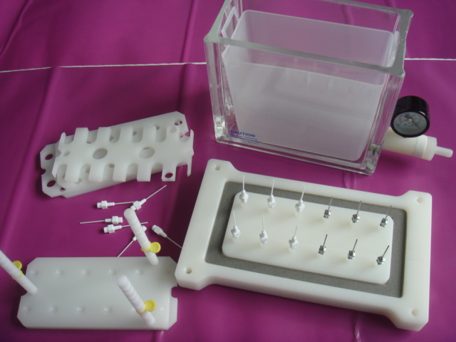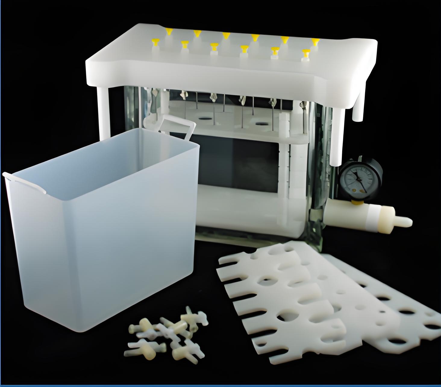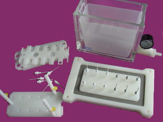Mediwax固相萃取裝置可實(shí)現(xiàn)連續(xù)的樣品萃取和過(guò)濾,簡(jiǎn)化復(fù)雜的樣品預(yù)處理過(guò)程并節(jié)約時(shí)間。整套裝置含有一個(gè)透明玻璃槽和頂蓋,可通過(guò)抽真空控制樣品流過(guò)SPE小柱實(shí)現(xiàn)萃取程序。通過(guò)調(diào)整玻璃槽里面的支架可容納不同規(guī)格的樣品收集管,包括玻璃或塑料試管、自動(dòng)樣品瓶、容量瓶以及錐形瓶等,洗脫液通過(guò)選擇聚丙烯(PP)或不銹鋼導(dǎo)向針以及防交叉污染的特氟?。?/span>Teflon)連接管直接引入樣品收集管。12位裝置附贈(zèng)一個(gè)聚丙烯(PP)廢液槽,用于操作中收集廢液,可簡(jiǎn)化樣品處理過(guò)程中廢液的處理以及保持玻璃槽內(nèi)潔凈的環(huán)境。